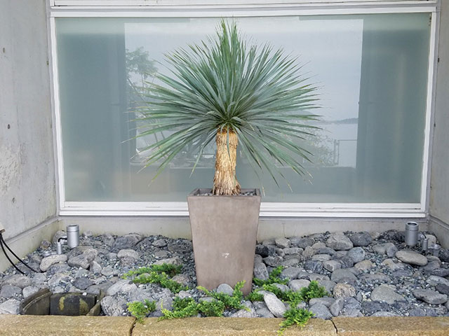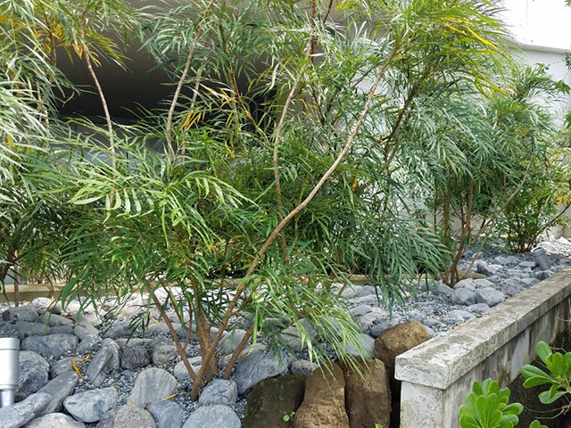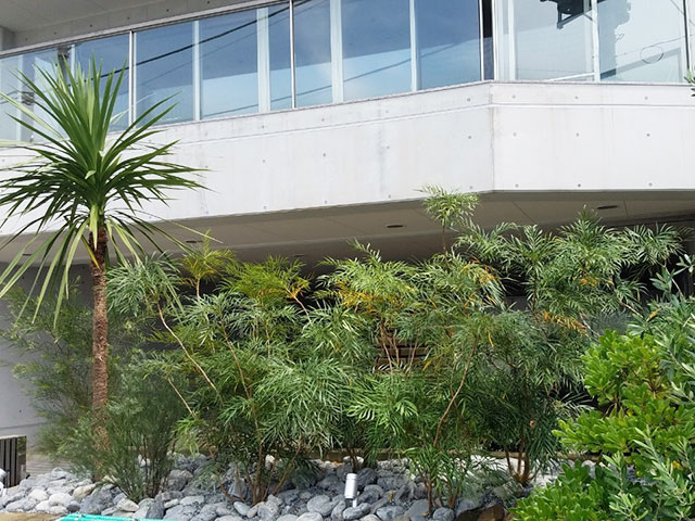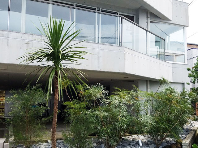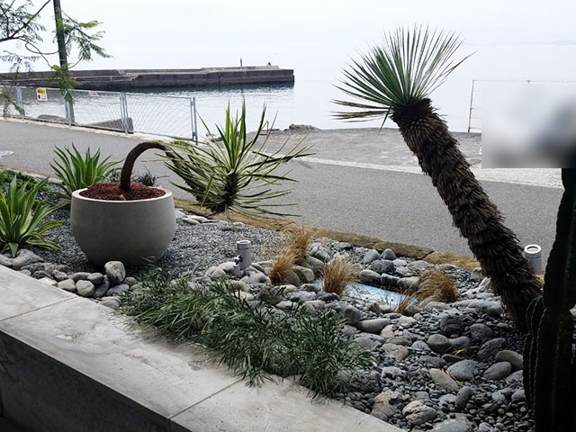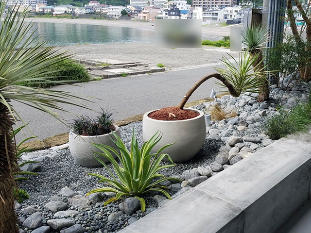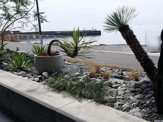 石垣で作った植栽スペースにヤシの木などを植栽し、カリフォルニアスタイルガーデンに仕上げました。